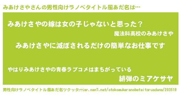 | 胡散臭い通販商品みたいなあだ名 | 『全米が絶賛したサプリメント…その名も「みあけさや」』 |