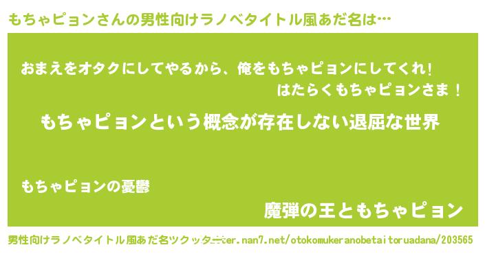 | 女子向けラノベタイトル風あだ名 | 『異世界で失敗しない100のもちゃピョン』 |