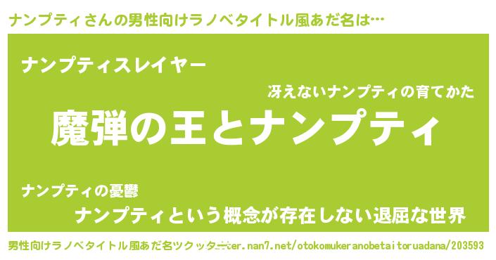 | 女子向けラノベタイトル風あだ名 | 『ナンプティが死なない童話 林檎のナンプティの診療簿』 |