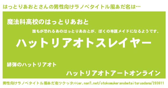 | 胡散臭い通販商品みたいなあだ名 | 『ガンによく効く高麗人参…その名も「はっとりあおと」』 |