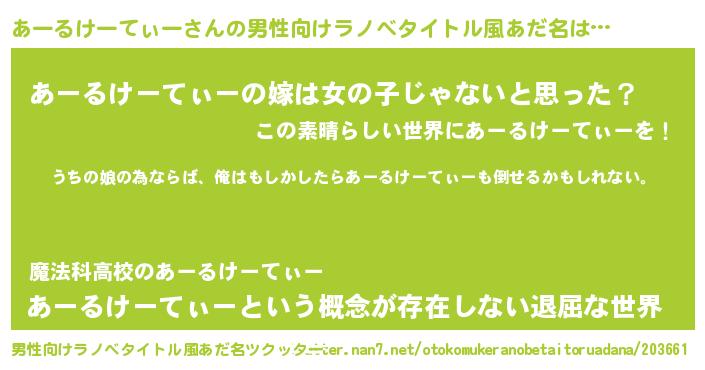 | 女子向けラノベタイトル風あだ名 | 『あーるけーてぃーの婚約者』 |