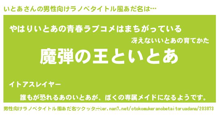 | 女子向けラノベタイトル風あだ名 | 『乙女ゲームの破滅フラグしかない悪役いとあに転生してしまった…』 |