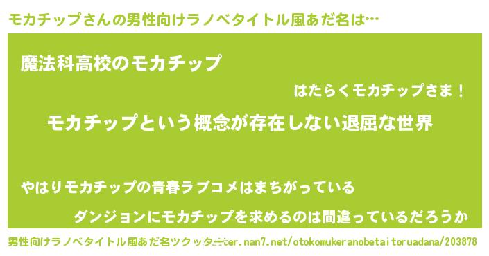 | 女子向けラノベタイトル風あだ名 | 『異世界で失敗しない100のモカチップ』 |