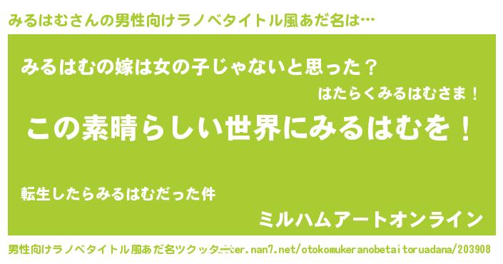 | 女子向けラノベタイトル風あだ名 | 『悪役みるはむに転生したようですが、知った事ではありません』 |
