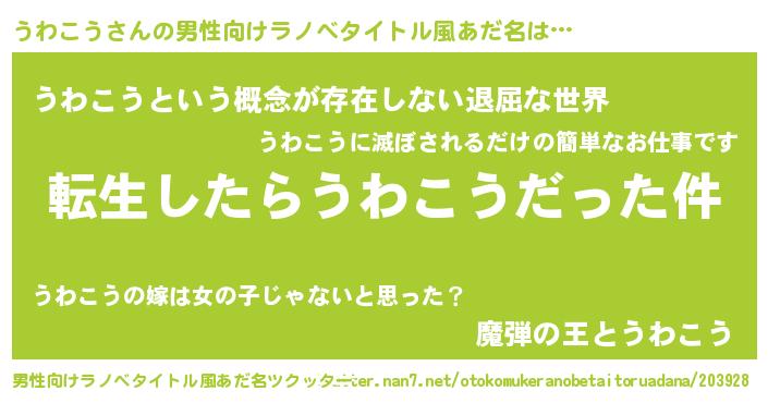 | 胡散臭い通販商品みたいなあだ名 | 『来世でも幸せになれる水素水…その名も「うわこう」』 |