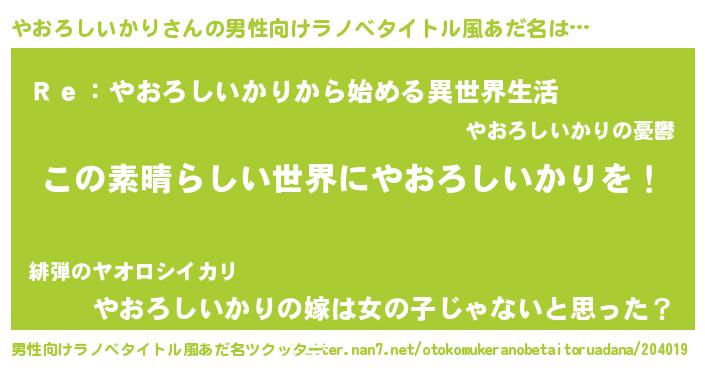 | 意味不明あだ名 | 『住所不定無職やおろしいかり(11歳)』 |
