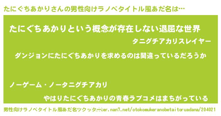 | 女子向けラノベタイトル風あだ名 | 『たにぐちあかりの卵を拾いまして』 |