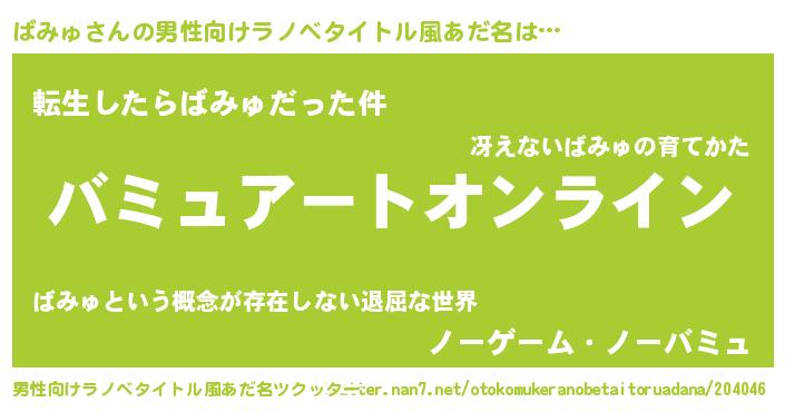| 女子向けラノベタイトル風あだ名 | 『誰かこのばみゅを説明してください! ~契約から始まるウェディング~』 |