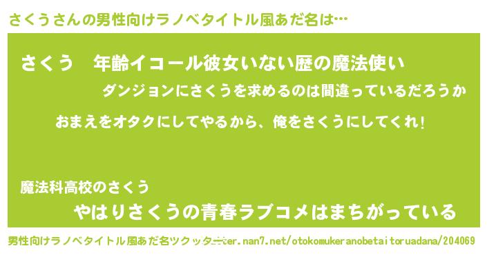 | 女子向けラノベタイトル風あだ名 | 『さくう夫妻のなれそめ』 |