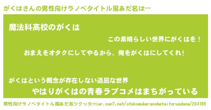 | 女子向けラノベタイトル風あだ名 | 『がくは夫妻のなれそめ』 |