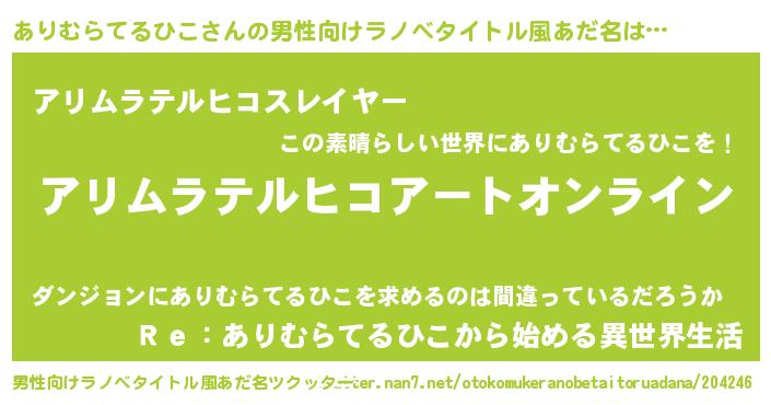 | 女子向けラノベタイトル風あだ名 | 『ありむらてるひこ姫と円卓の騎士』 |