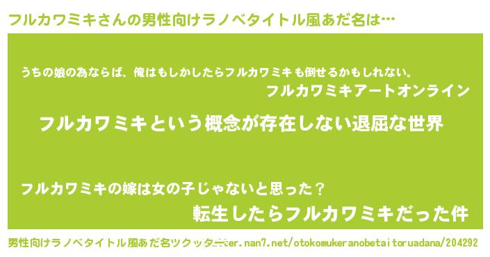 | 女子向けラノベタイトル風あだ名 | 『異世界で失敗しない100のフルカワミキ』 |