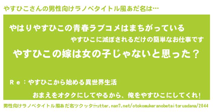 | 女子向けラノベタイトル風あだ名 | 『やすひこの卵を拾いまして』 |