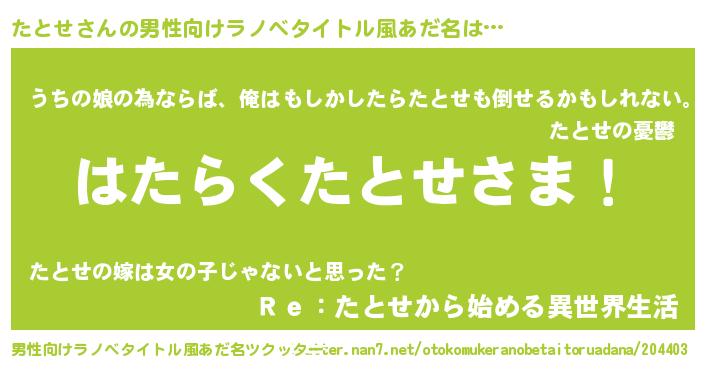 | 女子向けラノベタイトル風あだ名 | 『首の姫と首なしたとせ』『闇のたとせ』 |