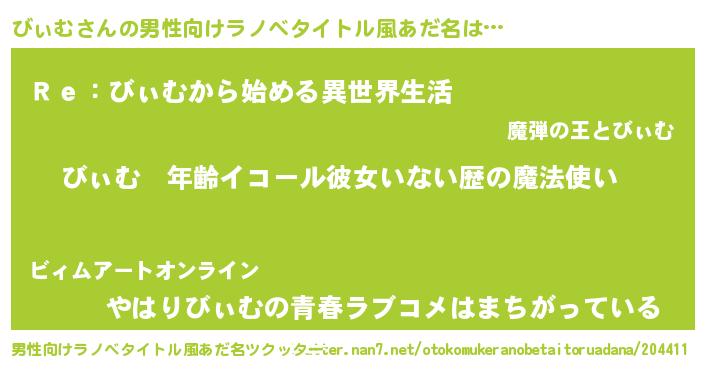 | 女子向けラノベタイトル風あだ名 | 『びぃむの玉の輿計画!』『闇のびぃむ』 |