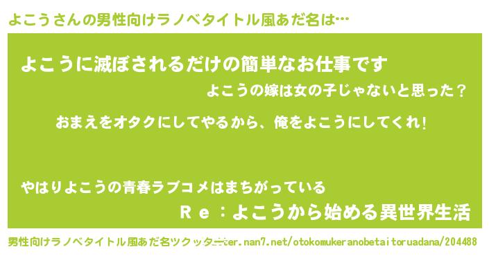 | 女子向けラノベタイトル風あだ名 | 『よこう夫妻のなれそめ』 |