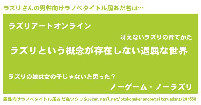 | 女子向けラノベタイトル風あだ名 | 『異世界で失敗しない100のラズリ』 |
