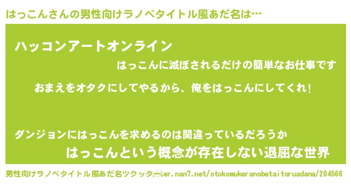 | 女子向けラノベタイトル風あだ名 | 『はっこん夫妻のなれそめ』 |