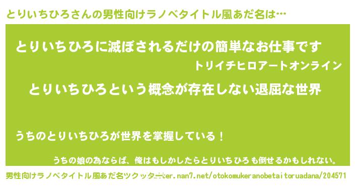 | 女子向けラノベタイトル風あだ名 | 『異世界で失敗しない100のとりいちひろ』 |