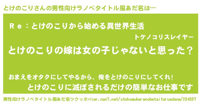 | 女子向けラノベタイトル風あだ名 | 『とけのこり様がみてる』 |