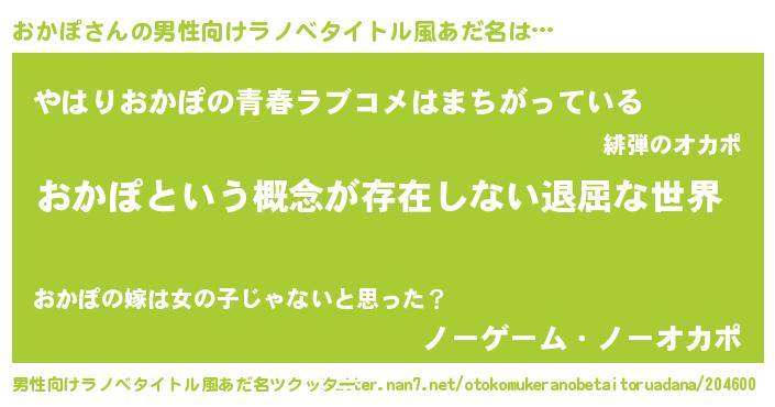 | 女子向けラノベタイトル風あだ名 | 『おかぽの契約王妃』『死神おかぽの再婚』 |
