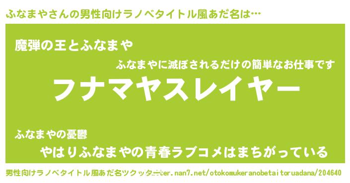 | 女子向けラノベタイトル風あだ名 | 『婚約破棄系悪役ふなまやに転生したので、保身に走りました。』 |
