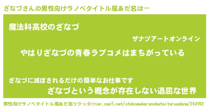 | 女子向けラノベタイトル風あだ名 | 『ざなづの雑貨屋さん』 |