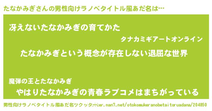| 女子向けラノベタイトル風あだ名 | 『異世界で失敗しない100のたなかみぎ』 |