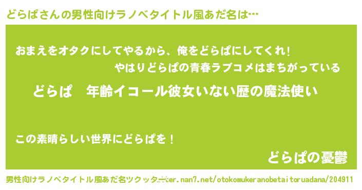 | 女子向けラノベタイトル風あだ名 | 『どらぱの玉の輿計画!』 |