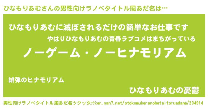 | 女子向けラノベタイトル風あだ名 | 『死神ひなもりあむの再婚』 |