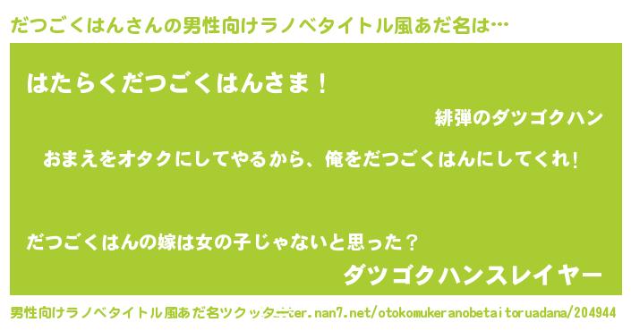 | 女子向けラノベタイトル風あだ名 | 『だつごくはん夫妻のなれそめ』 |