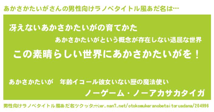 | 意味不明あだ名 | 『住所不定無職あかさかたいが(14歳)』 |
