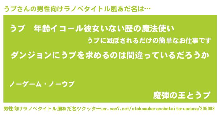 | 女子向けラノベタイトル風あだ名 | 『うブの卵を拾いまして』 |