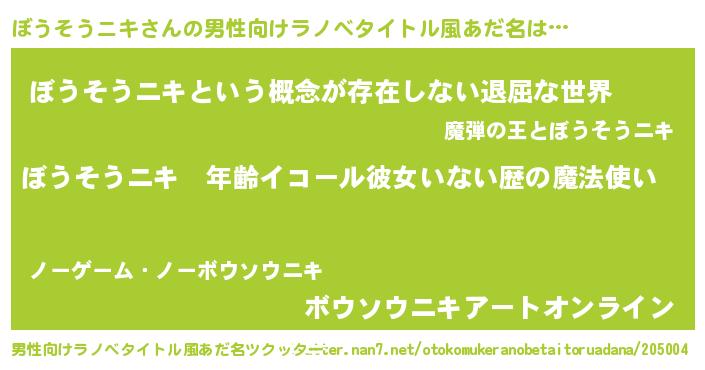 女子向けラノベタイトル風あだ名 | 『ぼうそうニキの玉の輿計画!』 |
