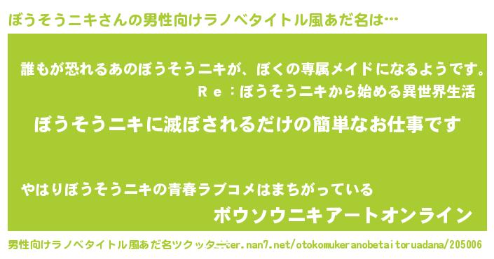 | 意味不明あだ名 | 『永久保存ぼうそうニキ』 |
