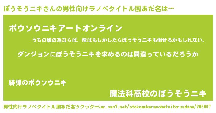 | 女子向けラノベタイトル風あだ名 | 『ぼうそうニキは平凡を望む』 |