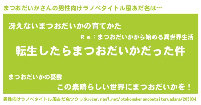 | 女子向けラノベタイトル風あだ名 | 『まつおだいかの玉の輿計画!』 |
