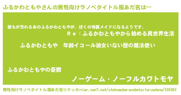 | 女子向けラノベタイトル風あだ名 | 『ふるかわともやの玉の輿計画!』 |
