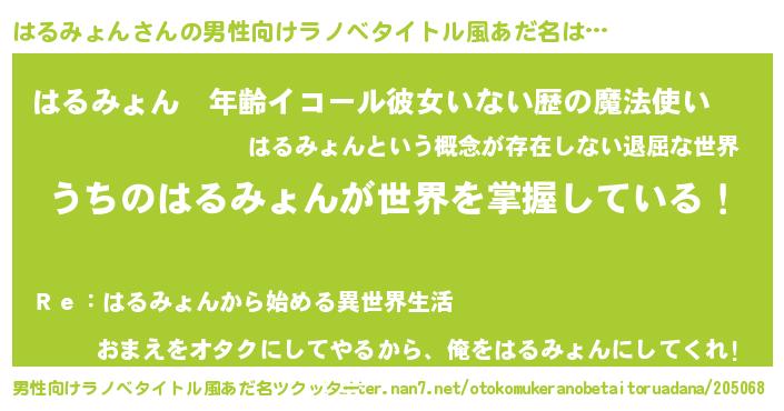 | 女子向けラノベタイトル風あだ名 | 『男装はるみょんの憂鬱な任務』 |