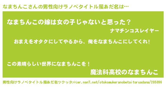 | 女子向けラノベタイトル風あだ名 | 『なまちんこ夫妻のなれそめ』 |