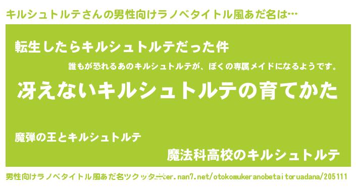 | ヘコむあだ名 | 『キルシュトルテ(笑)』『キルもー』 |