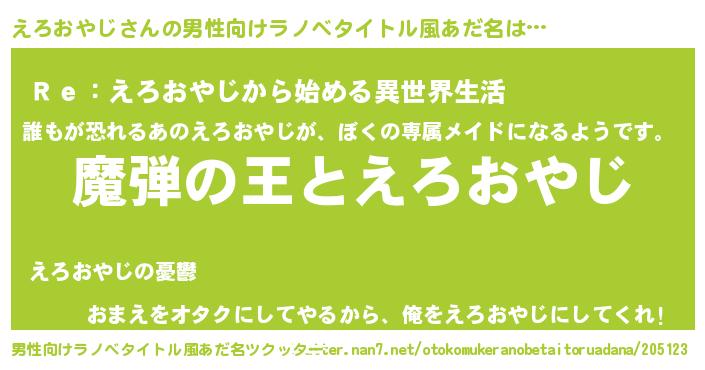 | 女子向けラノベタイトル風あだ名 | 『乙女ゲームの破滅フラグしかない悪役えろおやじに転生してしまった…』 |