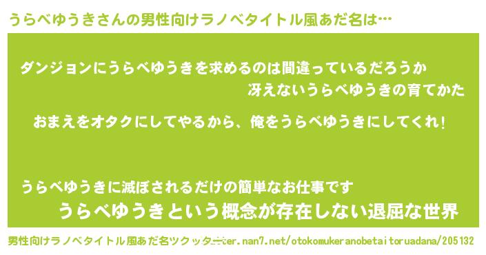| 胡散臭い通販商品みたいなあだ名 | 『100人中100人が認めたイリジウム磁石…その名も「うらべゆうき」』 |