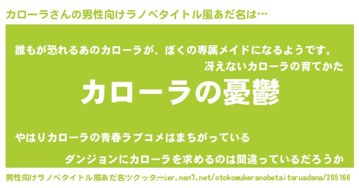 | 女子向けラノベタイトル風あだ名 | 『(仮)カローラのやんごとなき事情』 |
