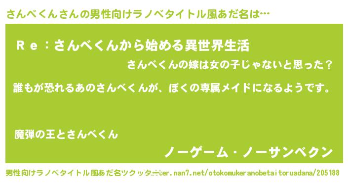 | 女子向けラノベタイトル風あだ名 | 『異世界でカフェさんべくんを開店しました。』 |