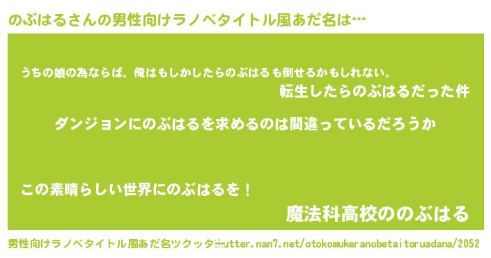 | 女子向けラノベタイトル風あだ名 | 『のぶはるの卵を拾いまして』 |