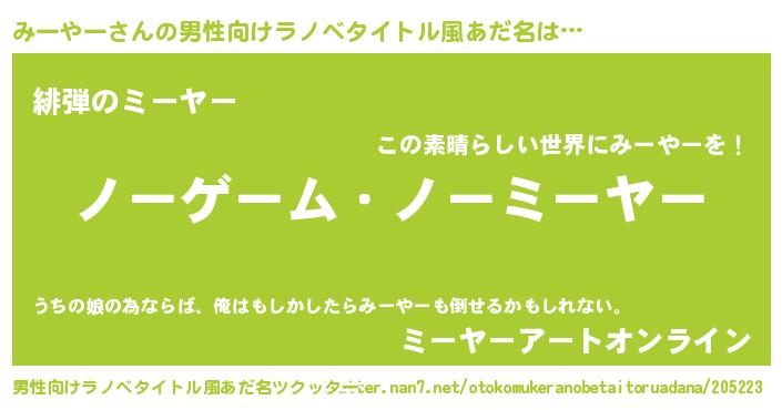 | 女子向けラノベタイトル風あだ名 | 『死神みーやーの再婚』 |