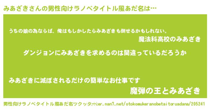 | 胡散臭い通販商品みたいなあだ名 | 『信頼と実績のサプリメント…その名も「みあざき」』 |