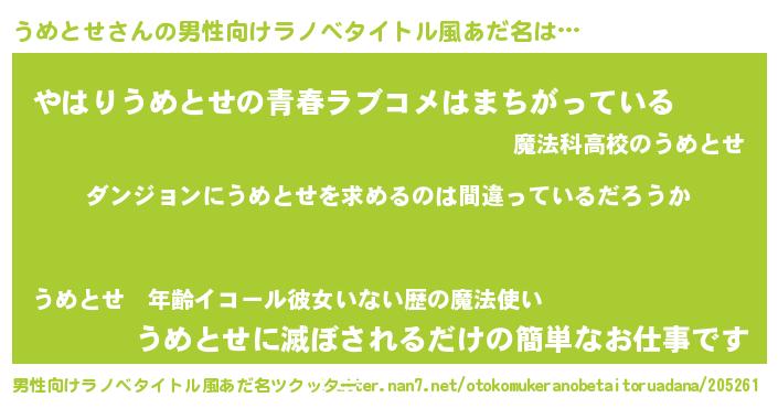 | 女子向けラノベタイトル風あだ名 | 『うめとせの卵を拾いまして』 |