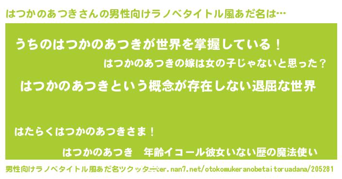 | 女子向けラノベタイトル風あだ名 | 『異世界で失敗しない100のはつかのあつき』 |